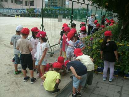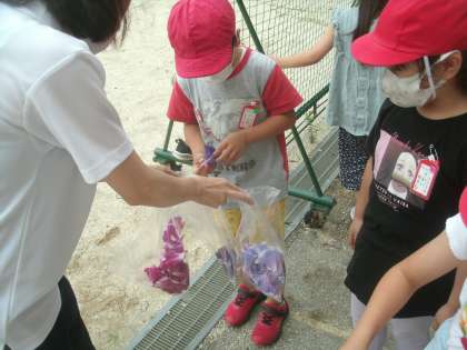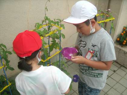 生活科学習の様子です。「いろみずあそび」をするためにアサガオの花を集めています。