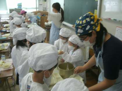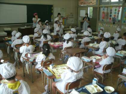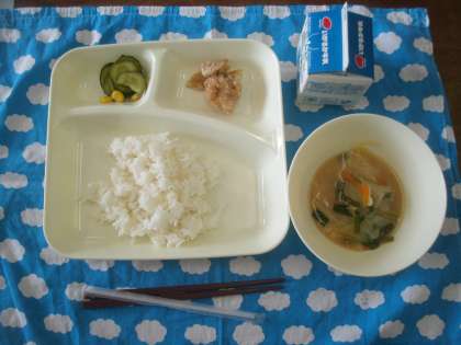 (今日の献立) 鶏肉のから揚げ 中華みそスープ きゅうりとコーンの甘酢あえ ごはん 牛乳