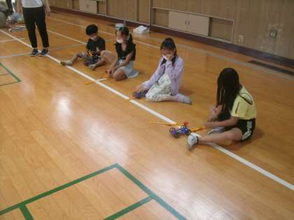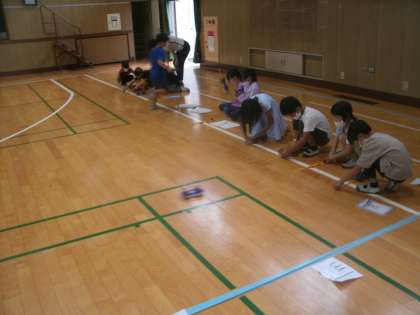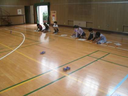 理科学習の様子です。体育館でゴムを使って走る車で実験に取り組んでいました。