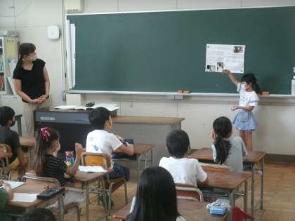 夏休みに描いた図画や自由研究の紹介をしています。