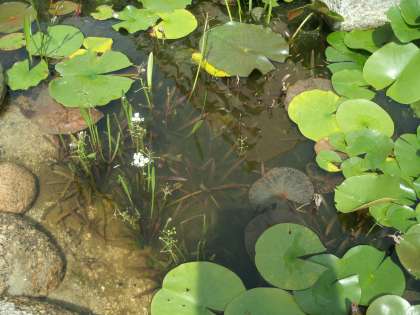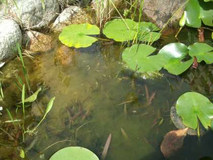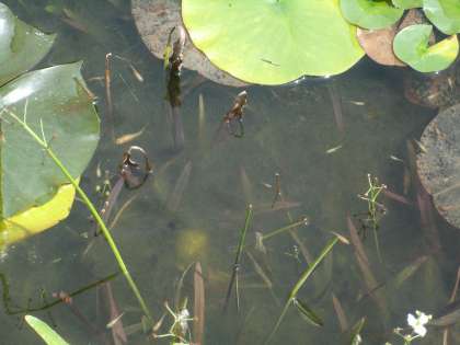 金塚小学校のメダカ池ではたくさんのメダカが泳いでいます。 この写真でわかっていただけるでしょうか。