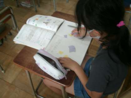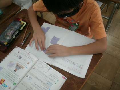 算数科学習の様子です。今日の学習課題は「どのような四角形でもしきつめられるかを考えよう」です。