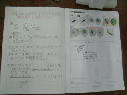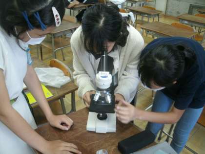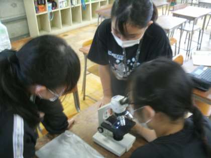 理科学習の様子です。「食物連鎖」について学習しています。大阪府教育センターでいただいてきたプランクトン「ミジンコ」「ゾウリムシ」「ボルボックス」「ミカヅキモ」を顕微鏡を使って観察しています。
