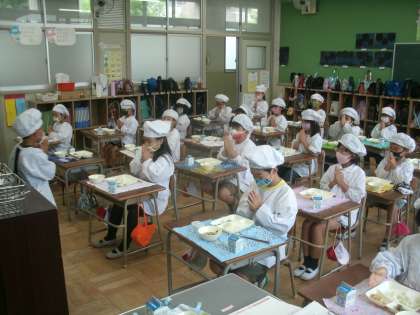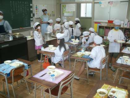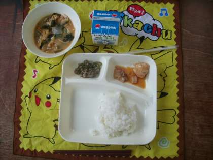 (今日の献立) 焼き鳥 みそ汁 ナスのそぼろ炒め ごはん 牛乳