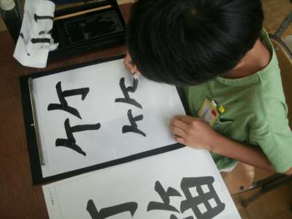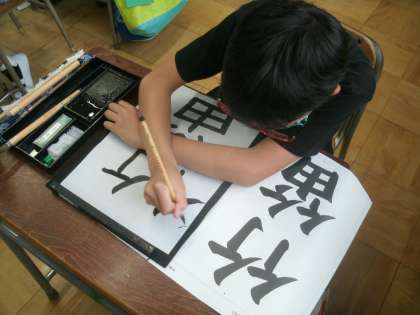 書写学習の様子です。今日は毛筆で「竹笛」を書いています。
