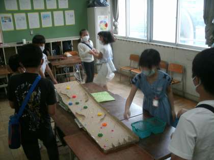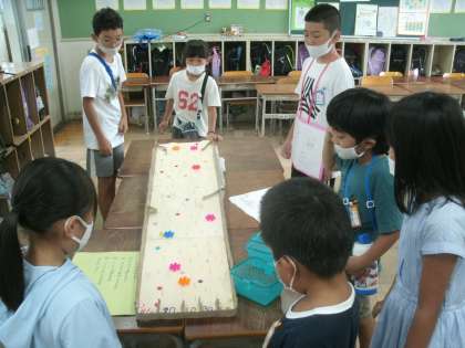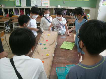 3年生のアトラクション「ビー玉ころがし」です。最高得点は50点。一生懸命狙うのですが上手く釘に弾かれて10点にイン。私は悔しい思いをしました。