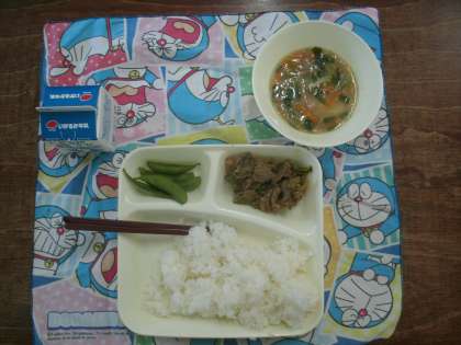 (今日の献立) プルコギ トック えだまめ ごはん 牛乳
