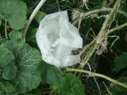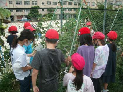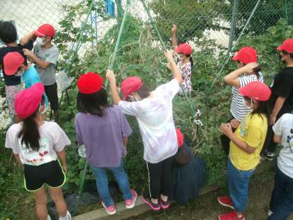 理科学習の様子です。学習園でカボチャのお花・め花を観察しています。おや?ビニル袋をかぶせられた花がありますよ。