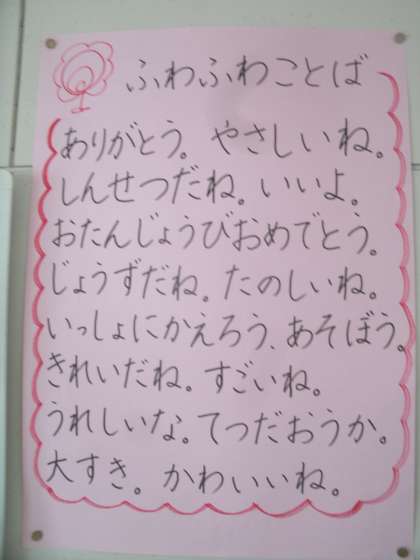 「ふわふわことば」 1年生 公開日 2021/09/14 更新日 2021/09/14 お知らせ 今週は「やさしさウイーク」です。1年生の教室に子ども達から出てきた「ふわふわことば」が掲示されていました。子ども達のこんな言葉があふれる金塚小学校でありたいと思います。 いいね(0)