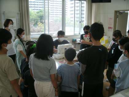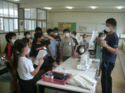 家庭科学習の様子です。初めてミシンを使います。しっかり使い方を聞いておくんだよ。