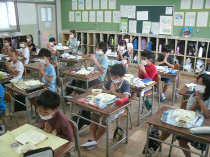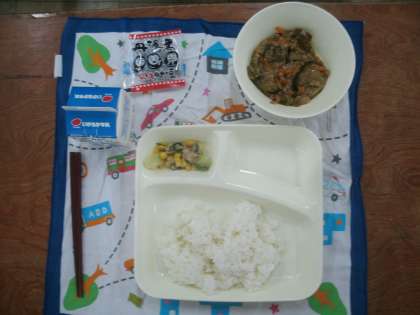 (今日の献立) マーボーなす ツナとチンゲンサイの炒め物 いり黒豆 ごはん 牛乳