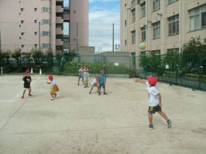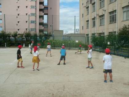 2年生が「良い子のドッジボールコート」でドッジボールをしていました。ずいぶん上手くなったね。