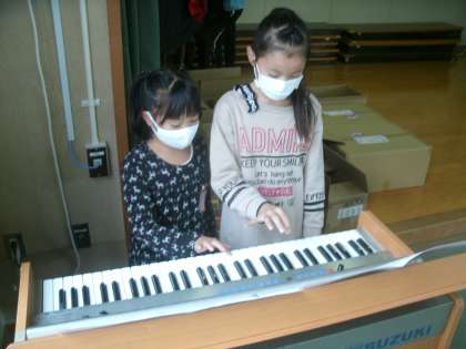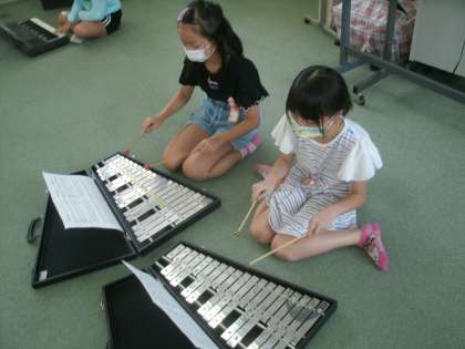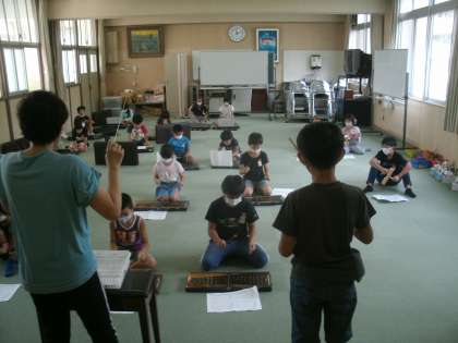 音楽科学習の様子です。多目的室に移動して「ゆかいな木きん」の合奏練習に取り組んでいました。