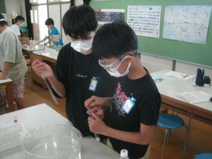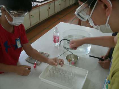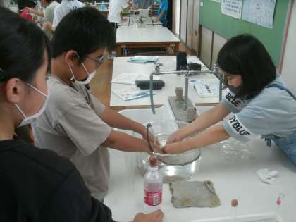 理科学習の様子です。理科室で実験に取り組んでいます。