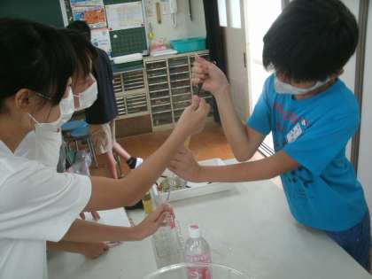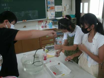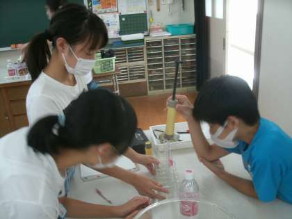 理科学習の様子です。炭酸水に溶けている二酸化炭素を水上置換法で試験管に集めています。
