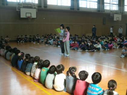 4月16日(木)、児童会主催の「入学を祝う会」を行いました。在校生からのお祝いのことばを聴く1年生の態度は、とてもすばらしかったです。全校でのゲーム(じゃんけん列車)に参加している様子は、とても楽しそうでした。