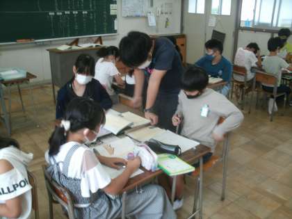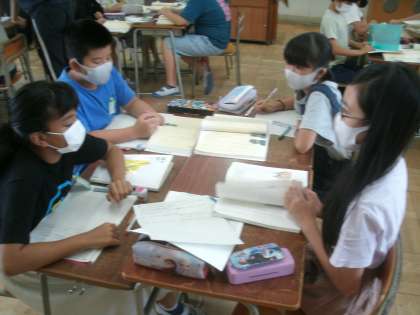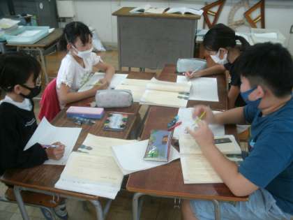 国語科学習の様子です。教材文は皆さんもよくご存じの宮沢賢治「注文の多い料理店」です。グループに分かれて意見交換をしながら、この話に出てくる二人の紳士の人物像を読み取っていきます。