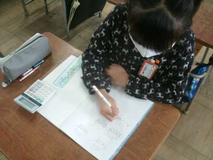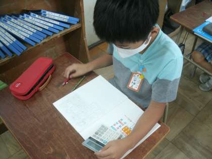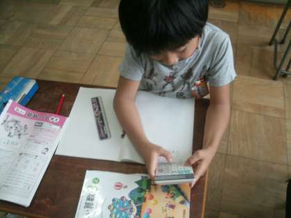 算数科学習の様子です。筆算の答え合わせに電卓を使っていました。