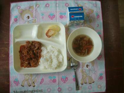 (今日の献立) タコライス もずくのスープ 焼きじゃが ごはん 牛乳