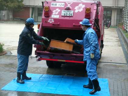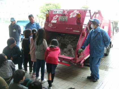 4月20日(月)、社会科学習の一環として大阪市環境局の方に来ていただき、4年生の子どもたちが体験学習に取り組みました。パッカー車へのごみの投入や粗大ごみ投入の見学、ごみの分別についての学習やクイズ等、盛りだくさんの2時間はアッという間に過ぎました。子どもたちにとって、たいへん興味深い体験学習になったことと思います。雨天の中、ご来校いただき、ご指導くださいました大阪市環境局の皆様、本当にありがとうございました。