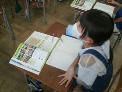 社会科学習の様子です。「工場ではたらく人びとの仕事」のふり返り学習に取り組んでいます。