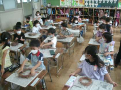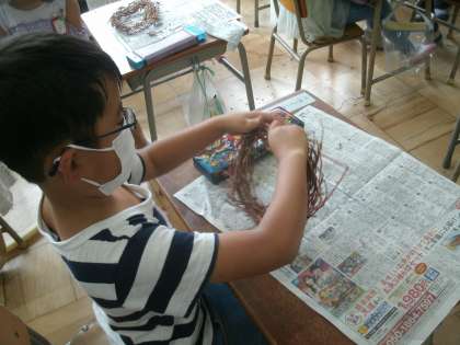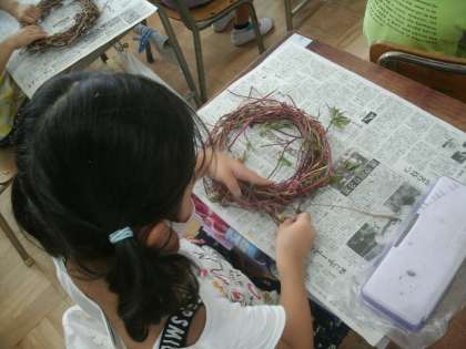 生活科学習の様子です。アサガオのつるを使ってリースを作ります。