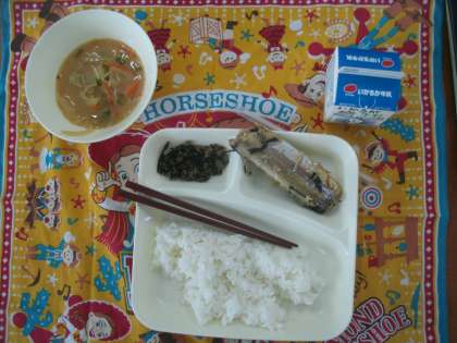 (今日の献立) さんまのみぞれかけ みそ汁 牛ひじきそぼろ ごはん 牛乳