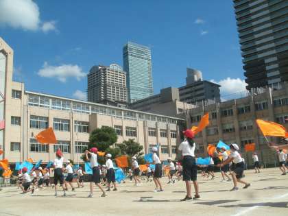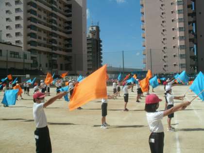 運動場に出て、団体演技の練習に取り組んでいました。