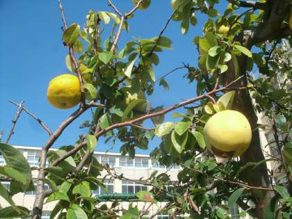 体育館前の花梨の実が黄色く色づいてきました。