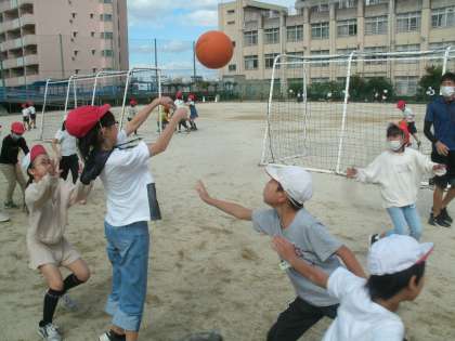 担任の近藤先生と一緒にバスケットボールを楽しんでいます。どんどん上手になっていきますね。