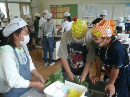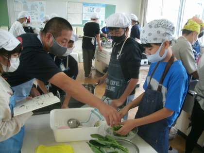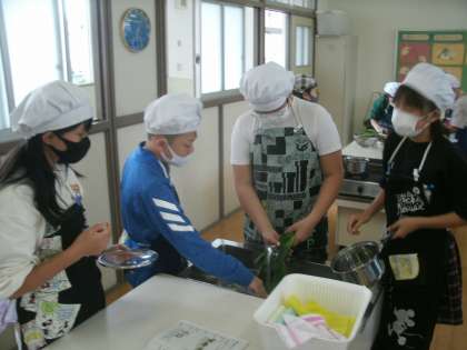 家庭科学習の様子です。調理実習に取り組んでいます。「ゆで卵」と「ホウレンソウのおひたし」の調理です。