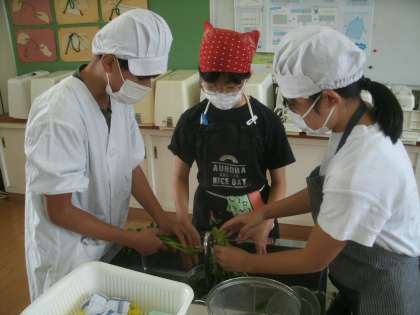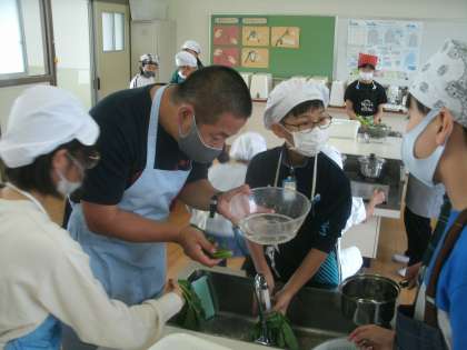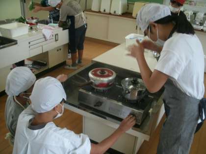 家庭科学習の様子です。みんな仲良く協力して調理に取り組んでいます。