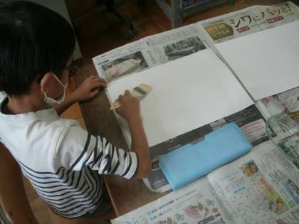 画用紙を水で濡らした後、横に刷毛を動かして、茜色の空を作ります。自然に少しむらができていい感じに仕上がりました。