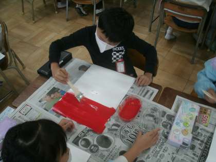 図画工作科学習の様子です。「ゆうやけぞらのトンボたち」という題材で作品を作ります。今日は「夕焼け空」」を描きます。
