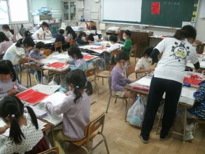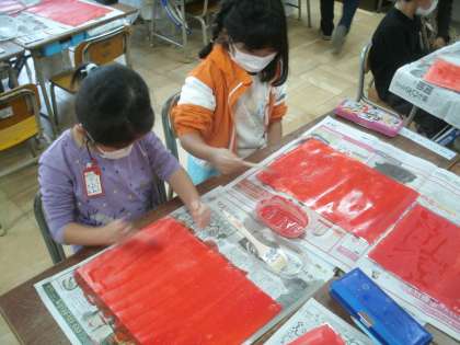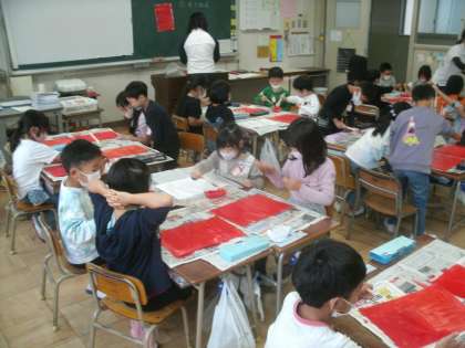 図画工作科学習の様子です。「ゆうやけぞらのトンボたち」という題材で作品を作ります。