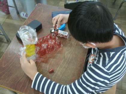 図画工作科学習の様子です。「クリスタルアニマル」という題材に取り組んでいます。ペットボトルを切ったり貼ったりして工夫しながら作品を仕上げていきます。