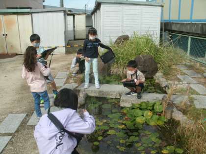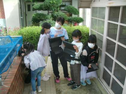 生活科学習の様子です。1年生の子ども達が一人一台端末を持って、運動場に飛び出してきました。虫を見つけて撮影するそうです。