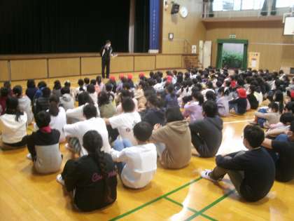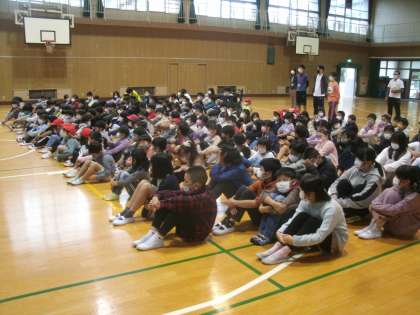 毎週月曜日は児童朝会があります。今日はあいにくの雨模様。全校児童が体育館に集まって朝のあいさつをしました。