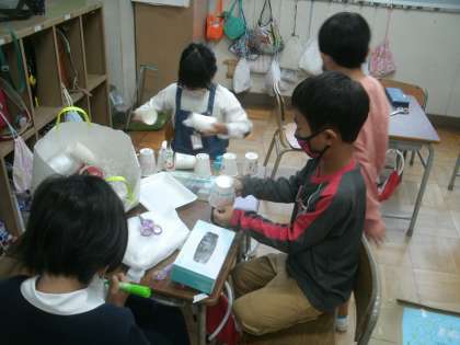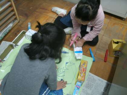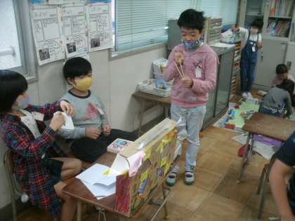 生活科学習の様子です。グループで相談しながら、手作りの楽しいゲームを作っています。自分たちが楽しむだけでなく、11月には招待し1年生を「おもちゃランド」に招待してくれるそうです。