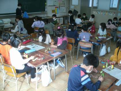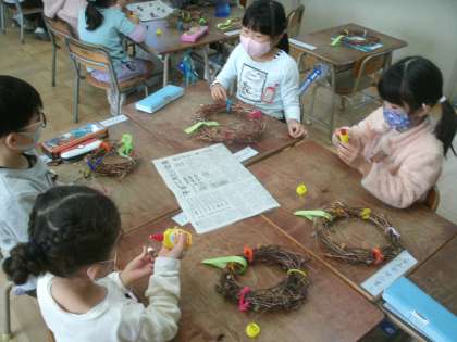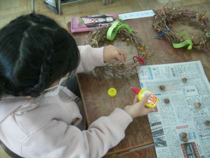 生活科学習の様子です。 アサガオのつるを使って作ったリースに飾りのどんぐりを付けよう。