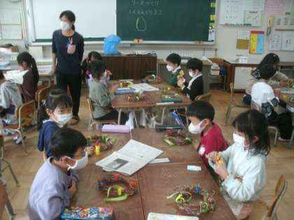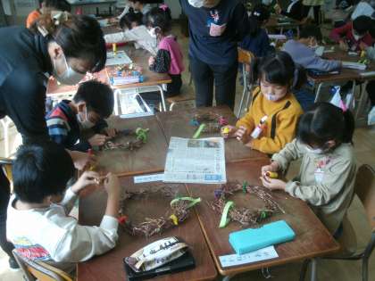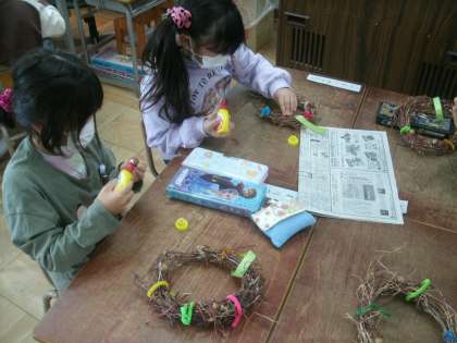「リース」 1年生(2) 公開日 2021/10/26 更新日 2021/10/26 お知らせ 生活科学習の様子です。以前、アサガオのつるでリースを作りました。そのリースに木工用ボンドでどんぐりをつけていきます。 いいね(0)