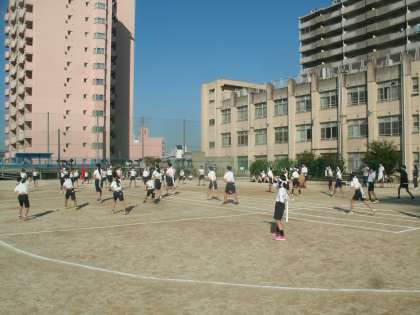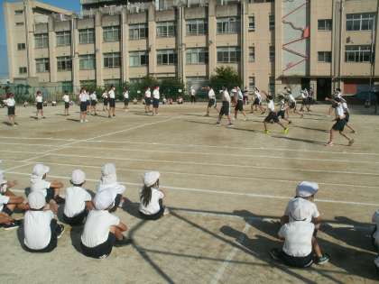 応援団が本番さながらに応援合戦をしました。それに合わせて全校児童も応援をしました。