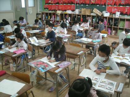 国語科学習の様子です。自分の紹介する乗り物が決まったら、一人一人ワークシートにまとめていきましょう。