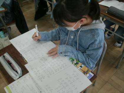 算数科学習の様子です。分数のたし算・ひき算の練習問題に取り組んでいます。