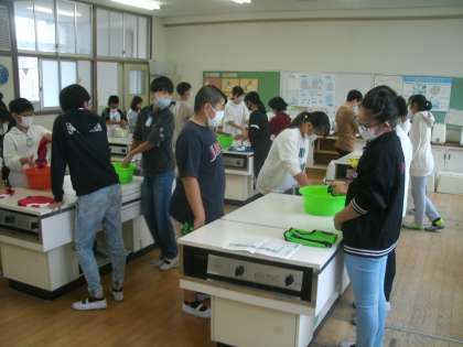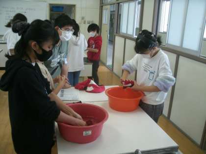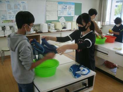 家庭科学習の様子です。今日は「洗濯実習」です。運動会で使ったビブスを洗います。