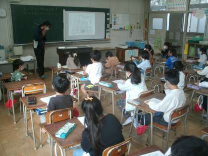 総合的な学習の様子です。今日はみんなで「町たんけん」に出かけます。