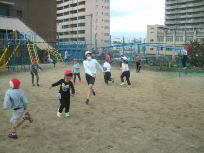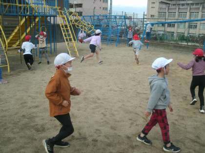 今日は1年生と2年生が鬼ごっこをして遊んでいました。6年生の女の子も一緒に遊んでくれています。