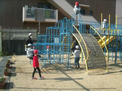 第2運動場の様子です。暖かい日差しの中で子ども達が元気よく遊んでいます。
