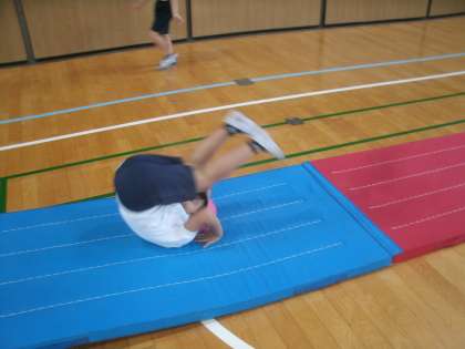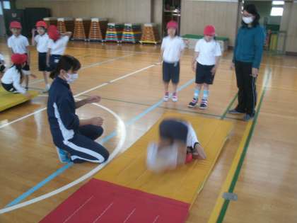 体育科学習の様子です。「マット遊び」に取り組んでいます。今日は後ろ回り(後転)です。