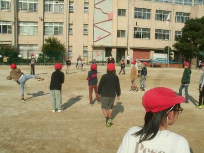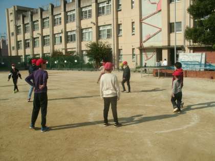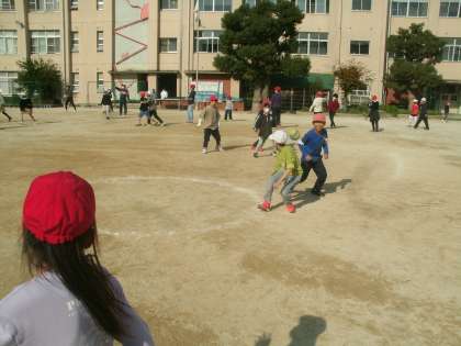 いい天気になりました。たくさんの子ども達と先生が運動場で遊んでいました。
